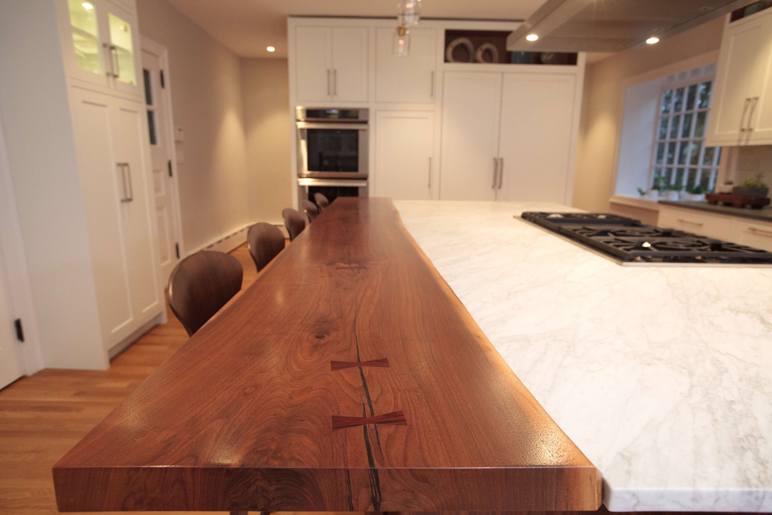 Designed by architect A. Raymond Holland in 1911 and added to in 1919, this three story stone colonial revival boasts incredible historic details and gracious formal spaces. The back of house, or service spaces, were originally designed for a household with staff and needed an enormous update that entailed a gut renovation, to accommodate a modern family. Our kitchen remodel reconfigured a compartmentalized breakfast room, laundry room, kitchen and pantry into one generous kitchen space. The mudroom cleverly tucks back behind the tall kitchen elements, open to the room but not visible until one wraps around. The butler’s pantry retains both its historic pie warmer, and location as a transition to the dining room, but completely opens to the kitchen and becomes an easy bar for entertaining with a second sink. Historic details, like the original call bell were restored and re-envisioned but settle in harmoniously with the new streamlined, modern cabinets and counters. The homeowners are art historians and collectors, and the walnut cabinetry niches create opportunities in the kitchen space for beautiful display. The massive marble island is contrasted with the raw edged walnut bar creating a striking centerpiece to the space.