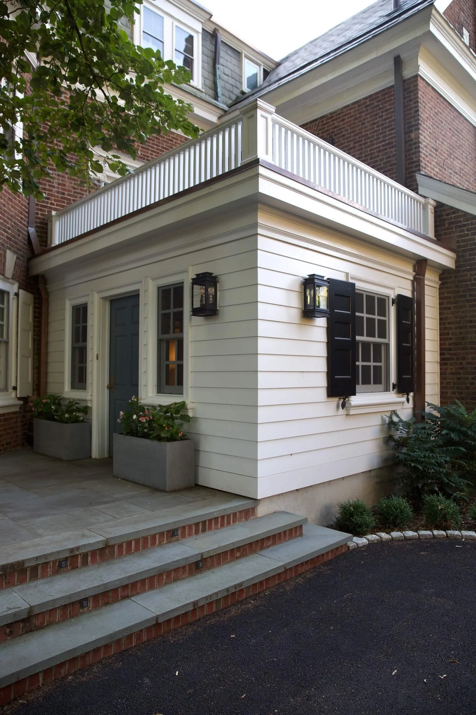 Originally designed in 1925 by Architect Lawrence Visscher Boyd, this historic brick colonial home, is 4500 square feet, but many spaces were underutilized. While retaining its beautiful details and much of the original character, the design required a gut renovation to the first floor including the kitchen, dining room, library, pantry, and powder room, as well as a new addition that would solve the circulation and flow issues plaguing the home. The formal “front” façade originally faced the side yard rather than the street, so its befuddling “main entrance” from the driveway was actually a back door to the kitchen. We solved this architecture identity crisis by designing an entry foyer addition with a new “front door.”