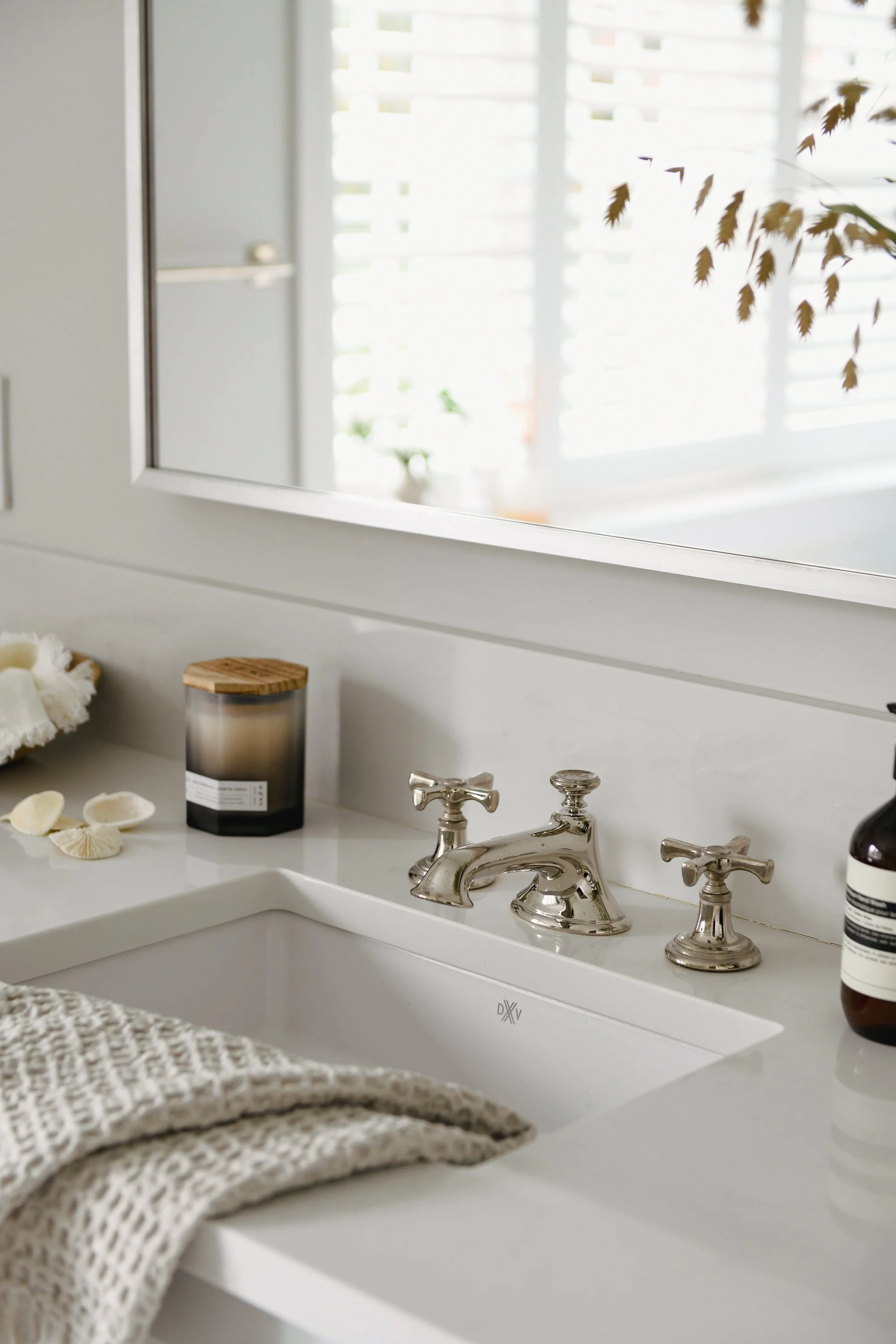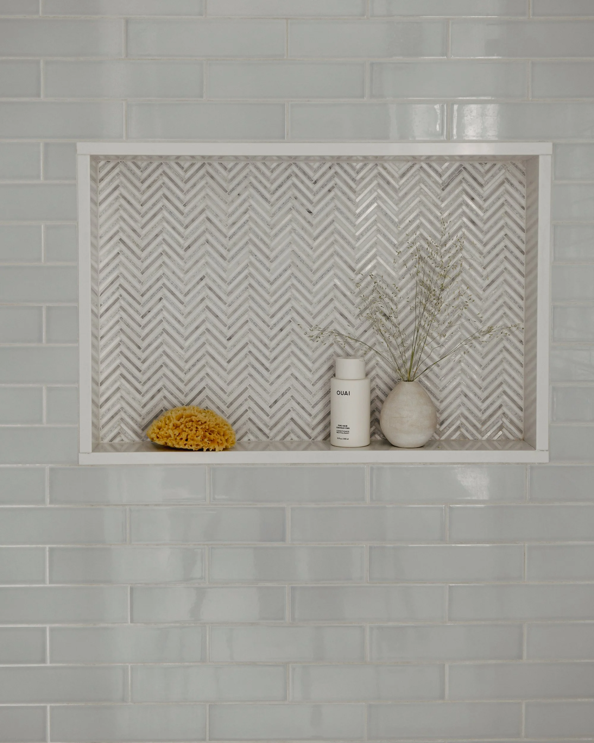 The primary bathroom remodel reconfigured an existing, but tired, master bath and a portion of a small spare bedroom into one generous bathroom space. We used the remainder of the spare bedroom space for the hall accessible laundry room. The bathroom evokes a spa like atmosphere, with a general palette of white with soft blues and grays.