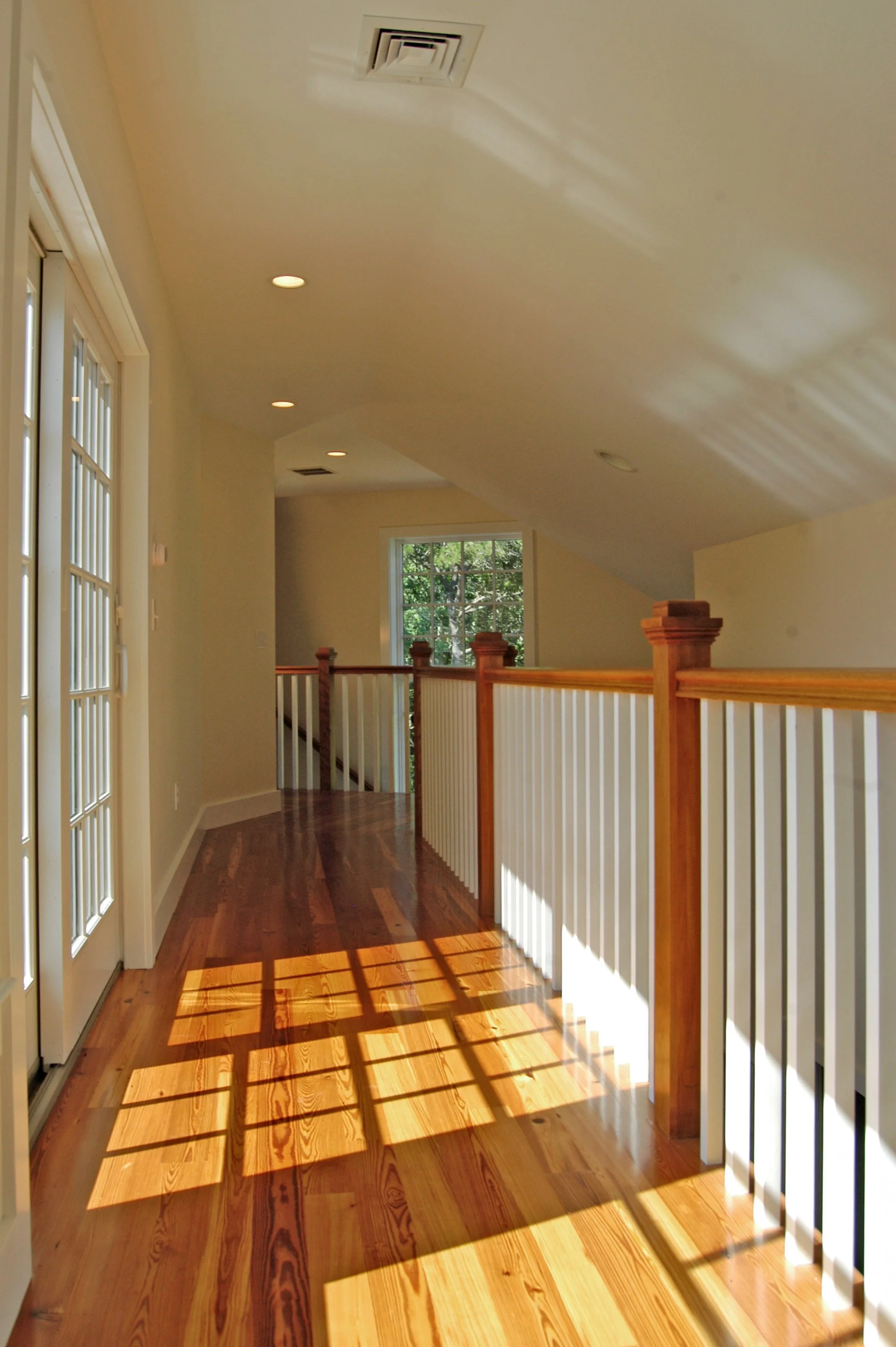 This family wanted to create a retreat for their grown children, grandchildren and and pets to come together, and to expand and update a traditional Cape for modern summer living. By adding a wing to the existing cottage, two additional bedrooms and a bath were gained upstairs, while the first floor married the charming existing knotty pine living room and dining room with a new airy kitchen and family room. The kitchen is in a central breezeway with an upper gallery hall that connects the old and new bedroom wings above. The secret balcony boasts a spectacular ocean view, and the enlarged deck allows for entertaining all summer long.