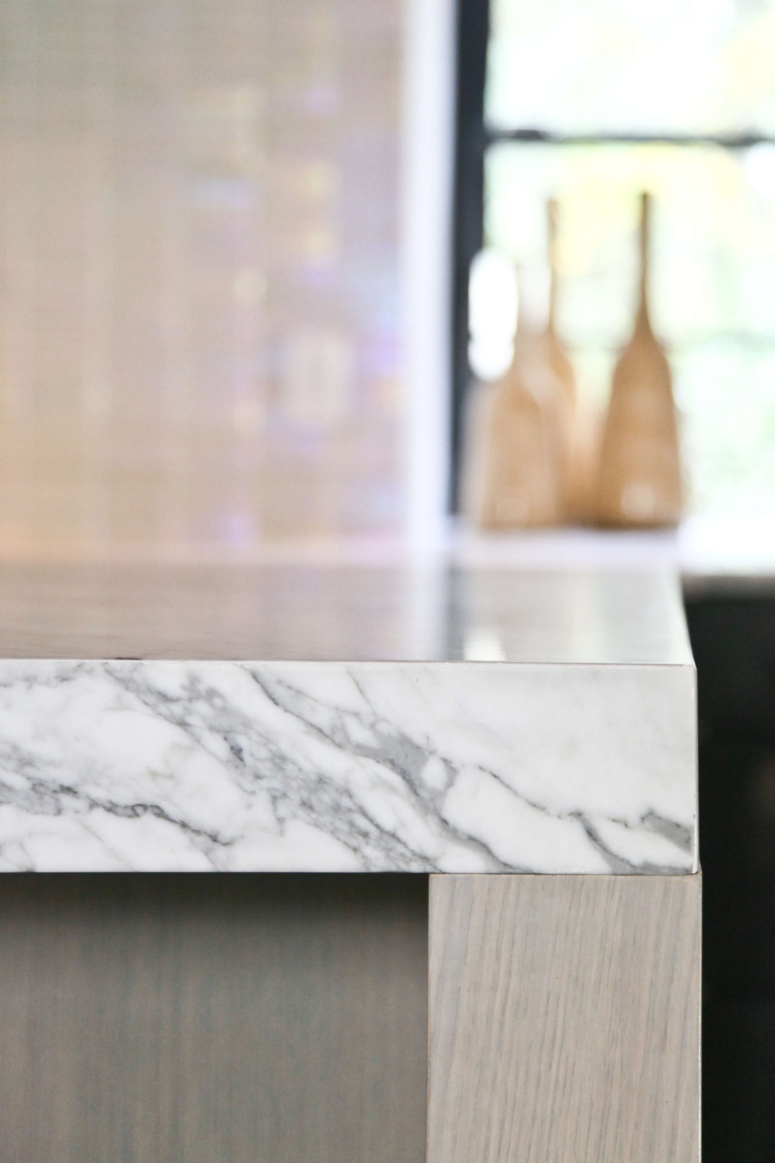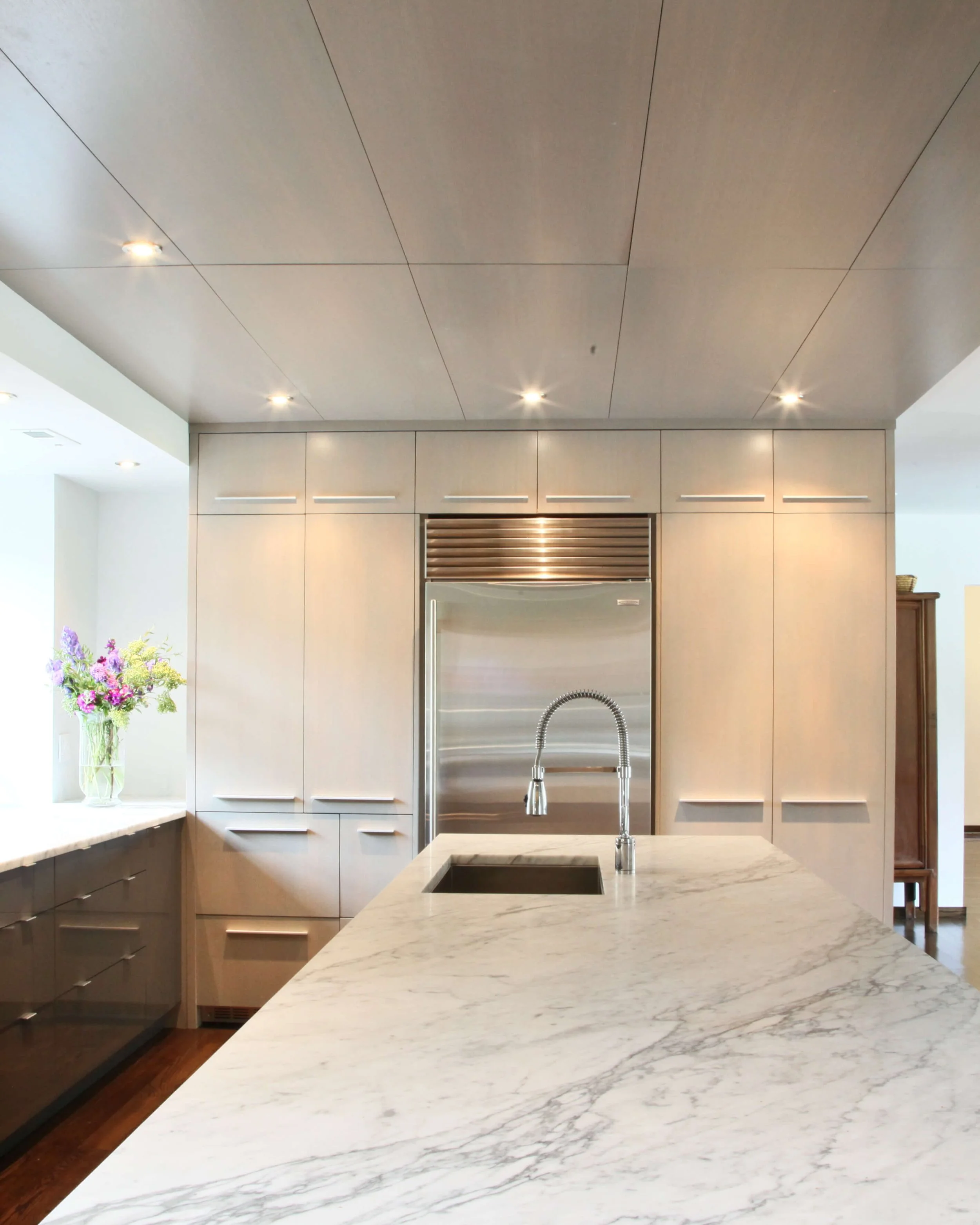 Even the clients’ specific cooking needs, like a juicing station, were built in to the design. The cabinet finished panels were considered to continue along the ceiling plane and around the corner enabling the woodwork to help establish a cohesive space, not limited to simple kitchen cabinets.