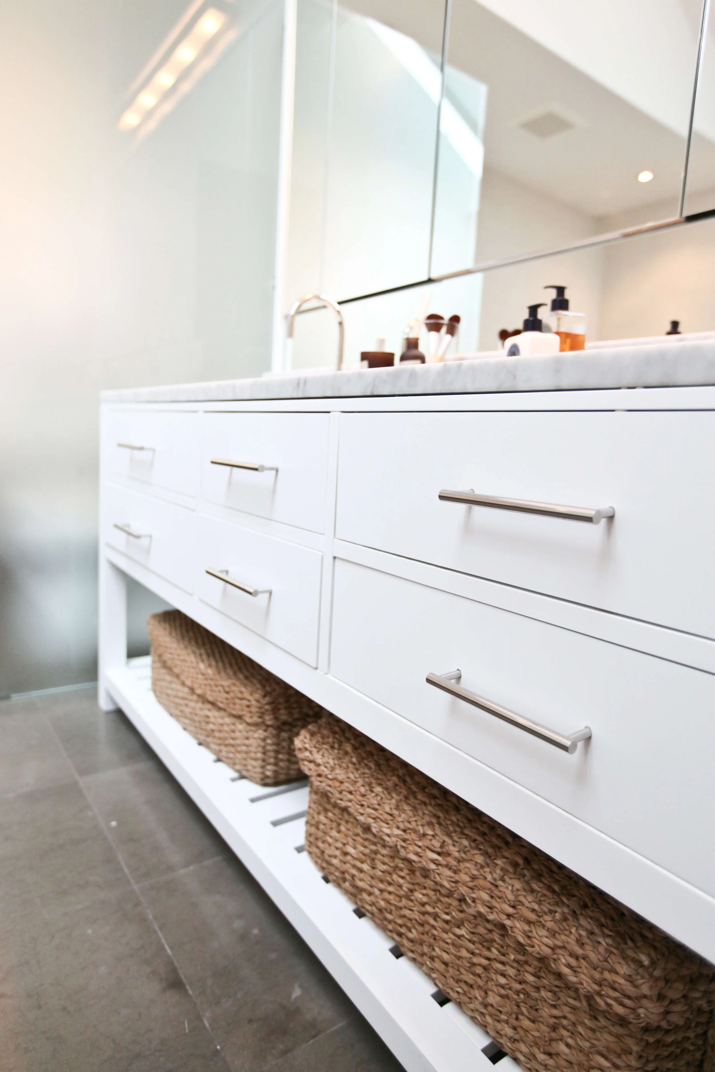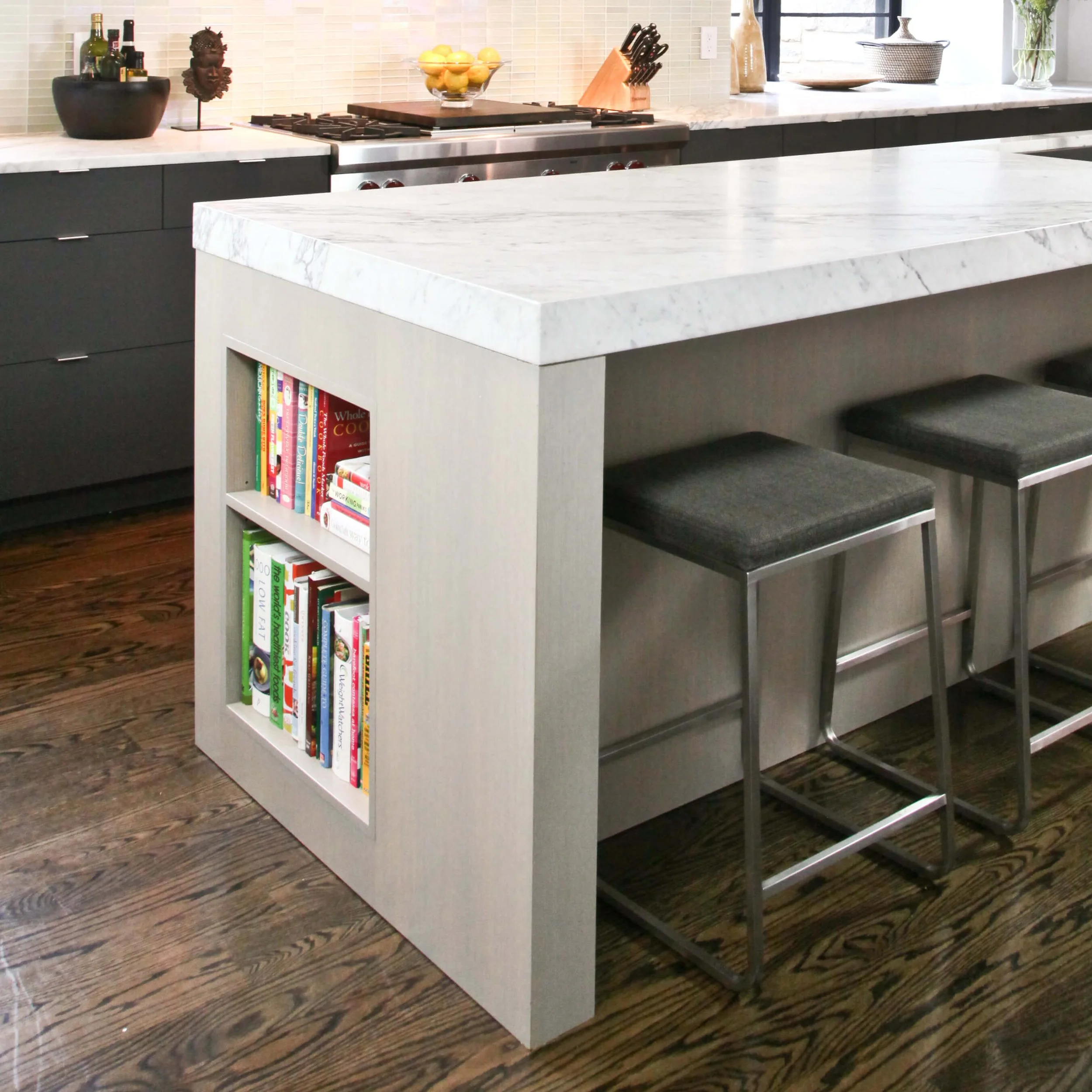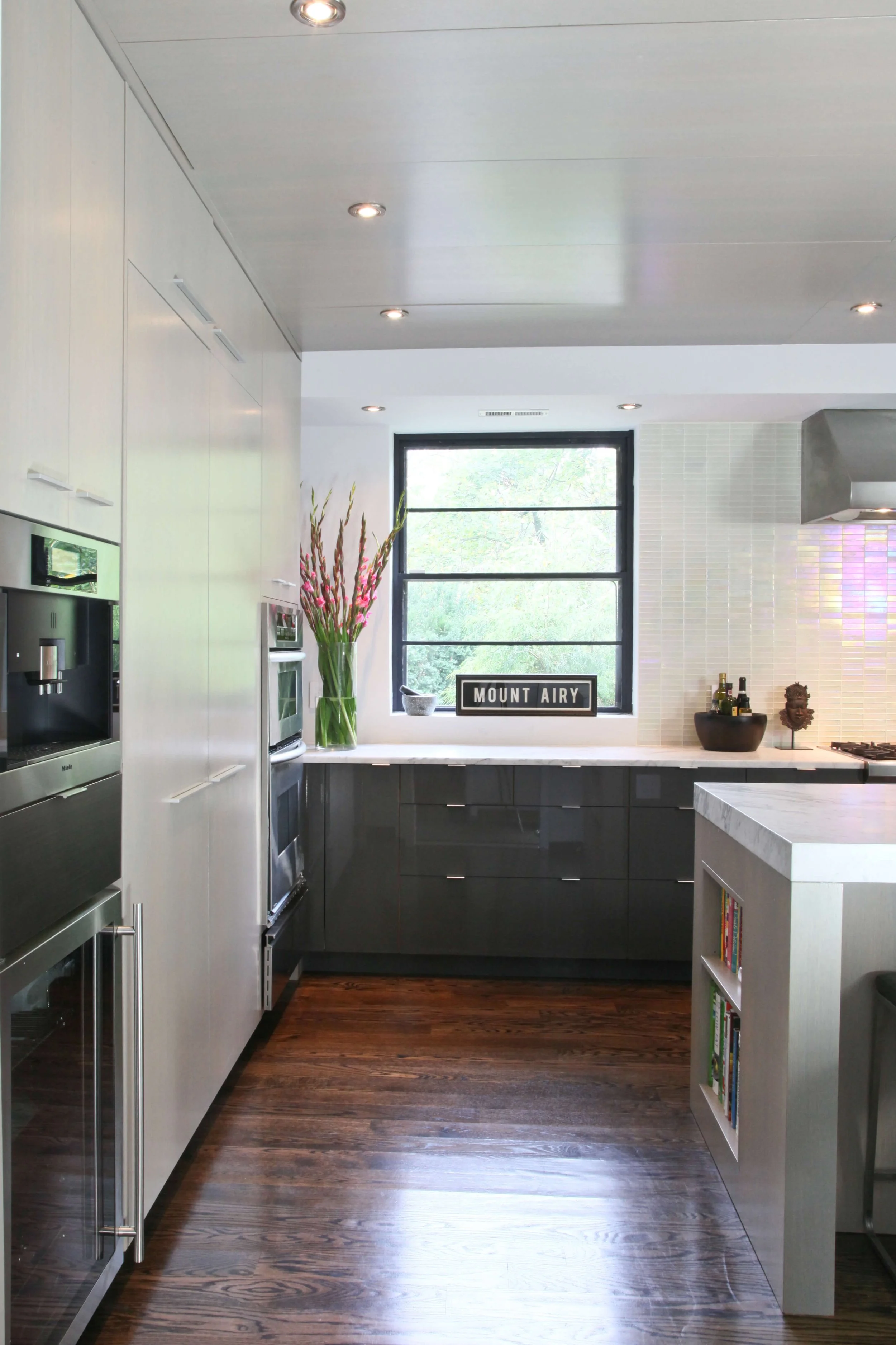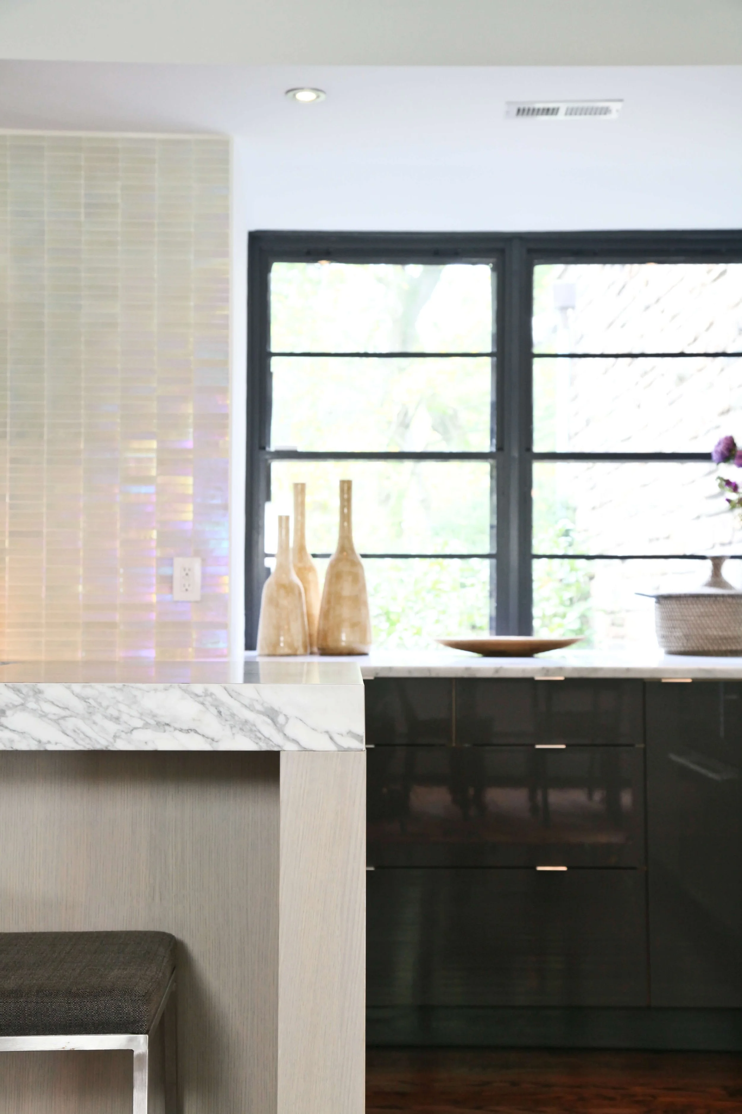 This mid century brick split level had been renovated without vision and was waiting for a modern update. With a full floor walkout basement and spacious first floor, the opportunities for airy open design were abundant. The kitchen lacked the sleek but comfortable feel the owners wanted, and needed to be envisioned with the entire first floor in mind. Reconfiguring some of the walls, and the relationship to the mudroom, dining room and entry opened up the space for continuous movement and views across the first floor. Custom grey washed oak cabinets compliment the statuary marble countertops. Two tones of gray add layering to the space.