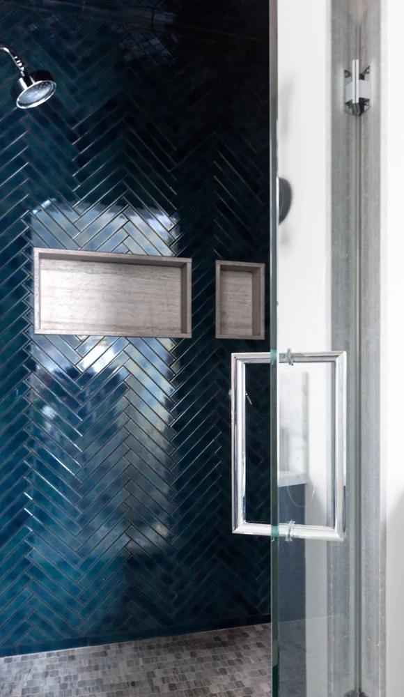 This master bathroom remodel subtly enlarged and rearranged a tired bathroom space into a useful and beautiful luxury bath retreat. The historic details were re-envisioned, with the vintage tub salvaged, repainted and enameled. Tile is the true showstopper here with a concrete patterned floor, and a stunning blue herringbone floor-to-ceiling shower with bench. A double vanity is featured where a previous opening existing, and room is made for a separate water closet. The results feel both vintage and modern, and delightful.